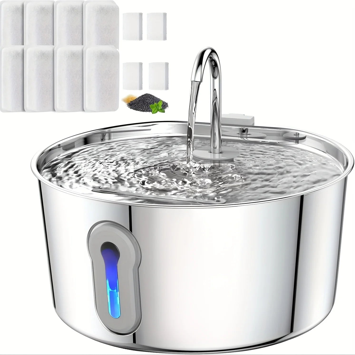 The fountain is made of 304 stainless steel which is durable, dishwasher safe and BPA-free. The new water level window allows you to easily monitor the water level without removing the lid. The pet fountain features an ultra-quiet 5V water pump with operating noise as low as 30dB. You'll only hear the gentle sound of flowing water, ensuring it won't disturb your sleep, even at night. It also features a filtration system for the water.